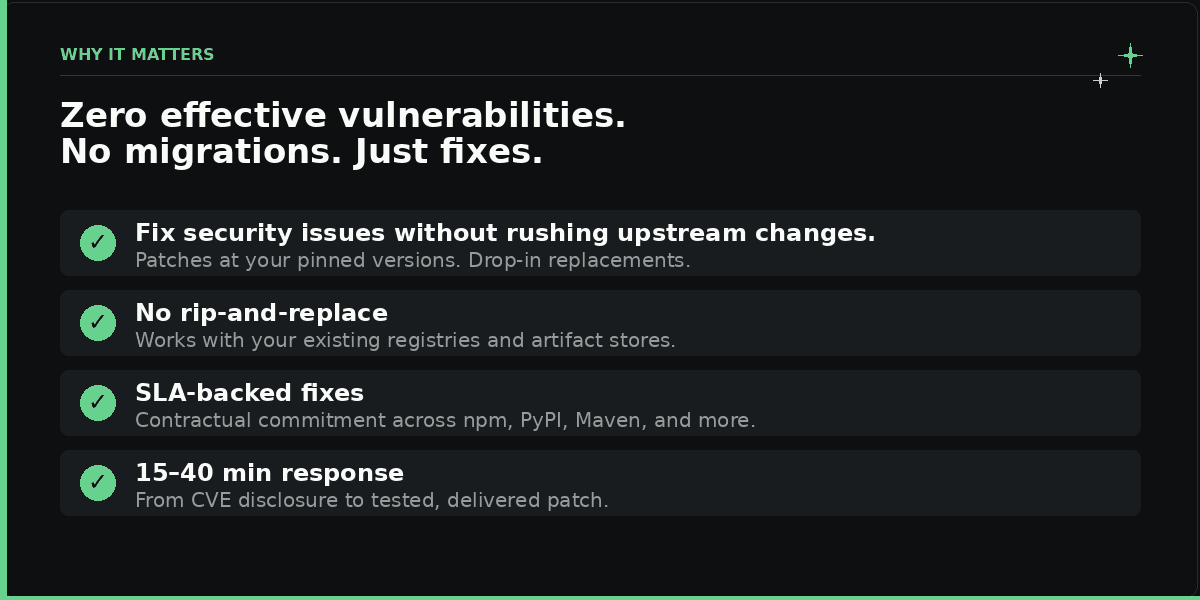 Fix: When a CVE drops, we don't send an alert and wish you luck. We research the vulnerability, patch it at your pinned version, test it, and deliver a fixed artifact directly to your repos and registries, often in 15–40 minutes from detection. Drop-in. No forced upgrades. No breaking changes.