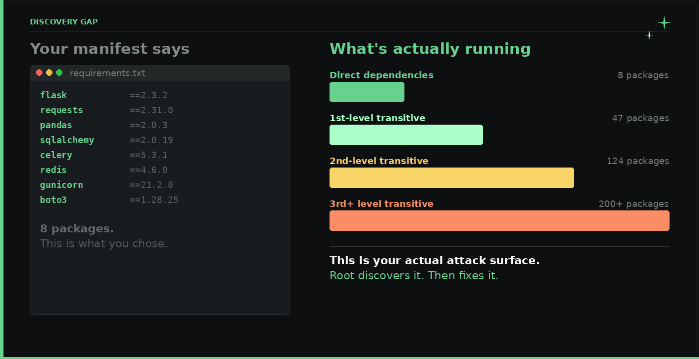 A majority of your CVE exposure lives in application dependencies, not the base OS. Not in the packages you chose. In the transitive dependencies that came along for the ride. When it comes to dependencies, Root starts with discovery. We're a secure supply platform that discovers what you actually use, then we fix it.