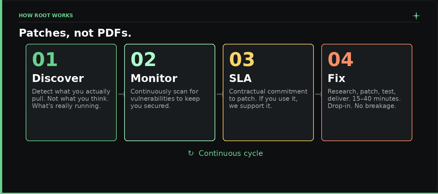 That's the cycle. That's the product. Patches not PDFs. We discover what you use and we fix it, at the versions you run, in the places you already work. For libraries, Root Library Catalog covers direct and transitive dependencies, with SLA-backed fix rates and Critical/High vulnerabilities and CISA KEV priority.